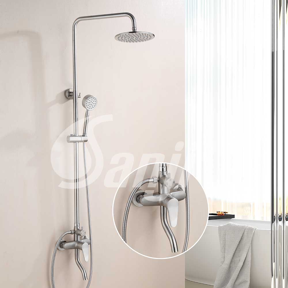 Bộ sen cây nóng lạnh inox 304 Sanji SCI-03 sử dụng cần ống đứng inox dày 1.3mm, bề mặt đánh bóng xước mờ, với thiết kế thay đổi chiều cao và hướng linh hoạt, chiều cao tối đa đạt 130cm.